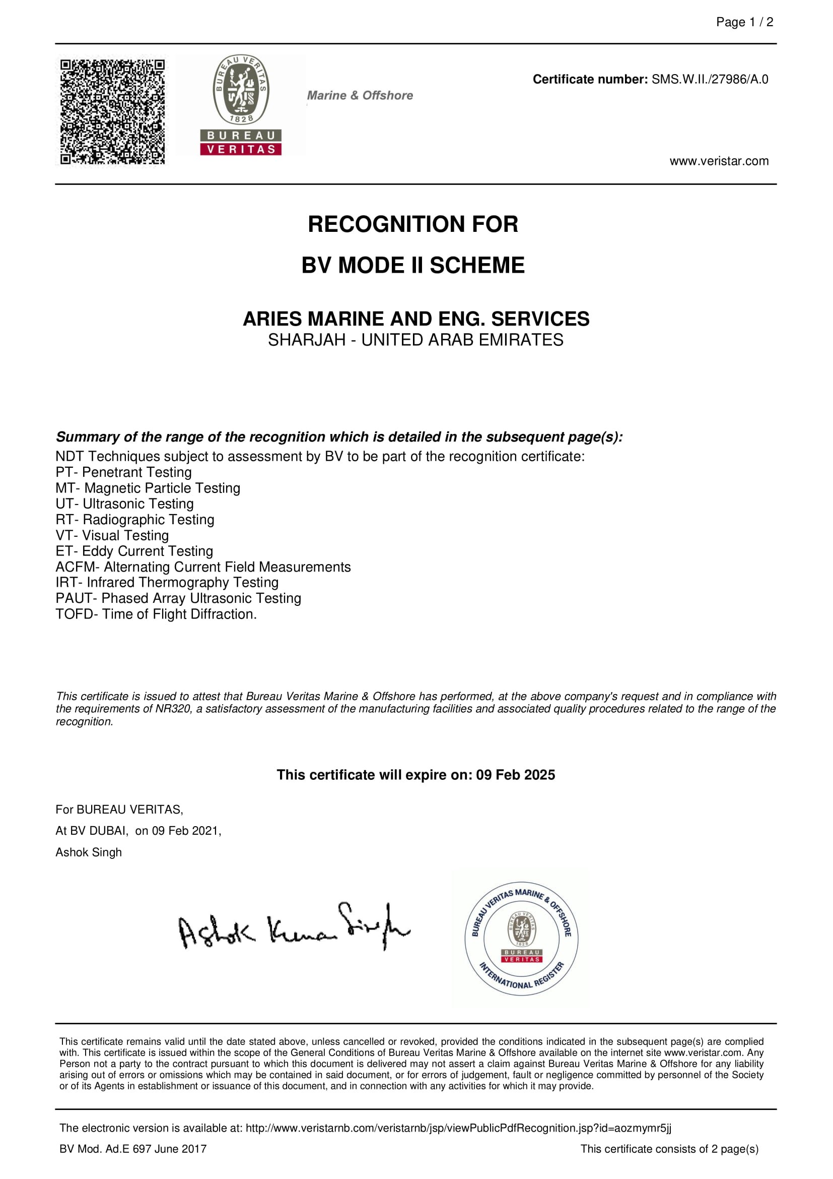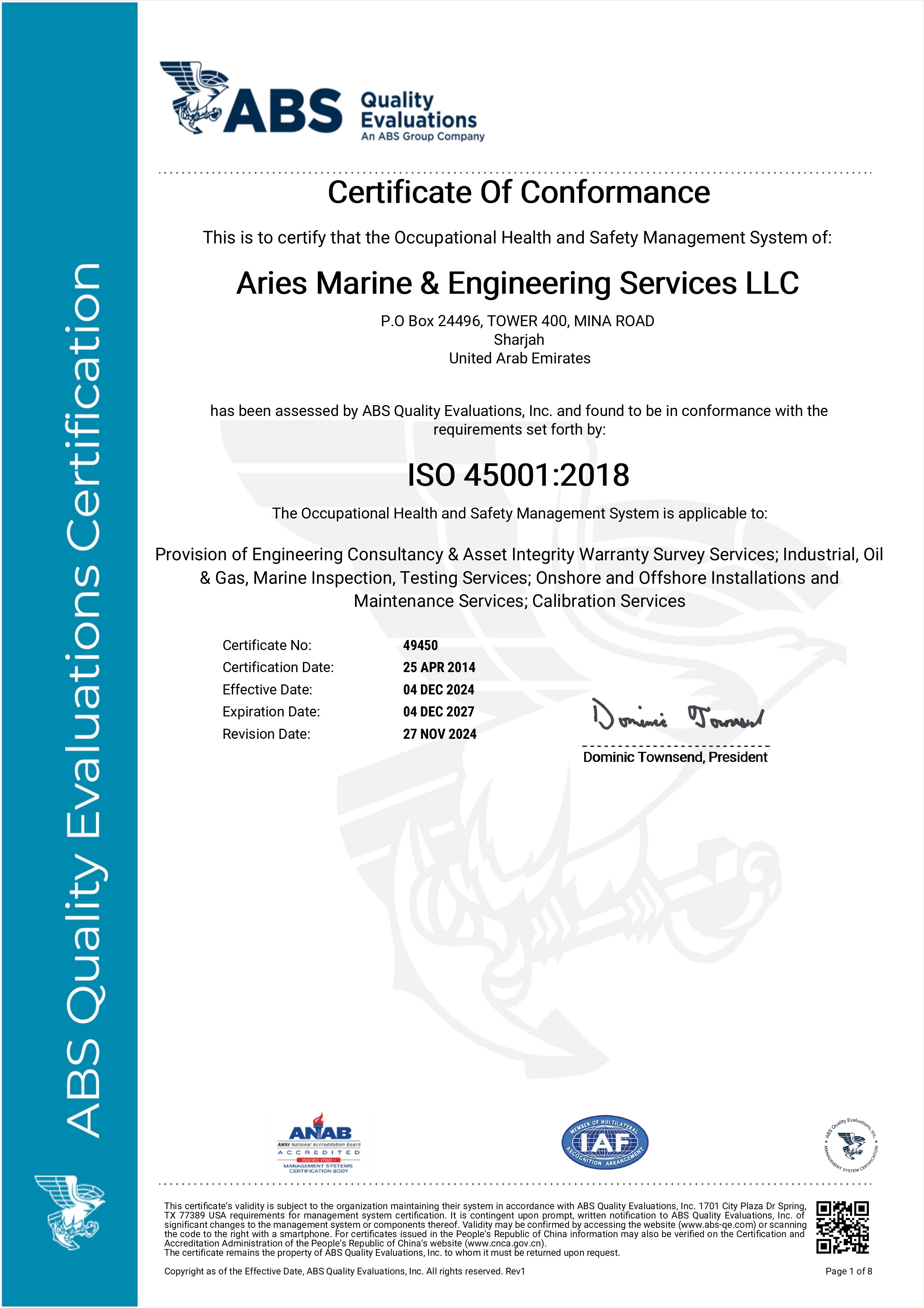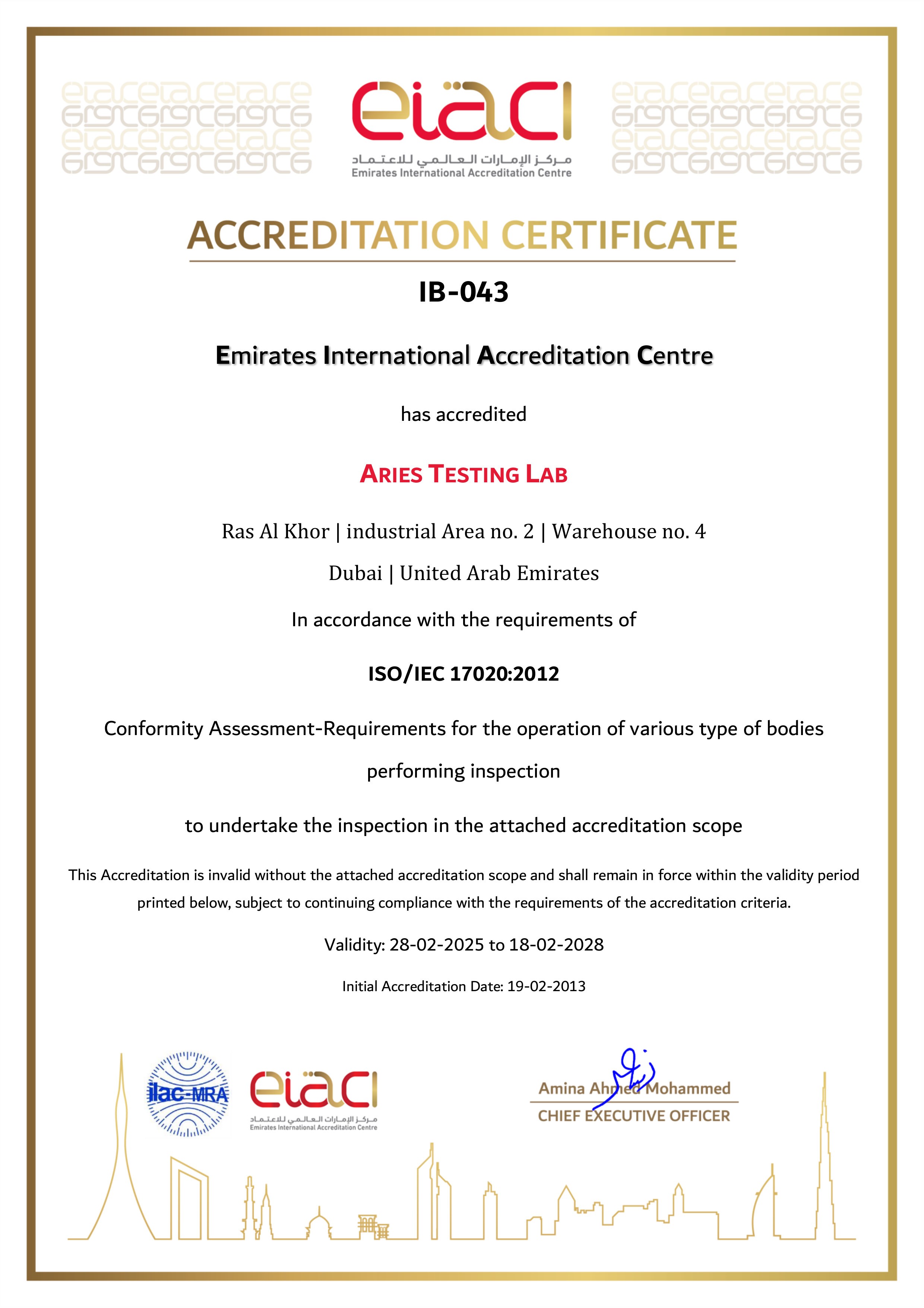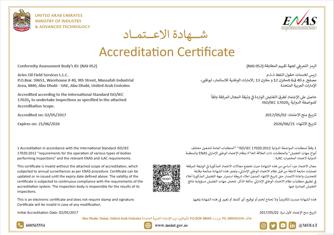 AOFS- ISO/IEC 17020:2012 by ENAS, details Scope available on request.